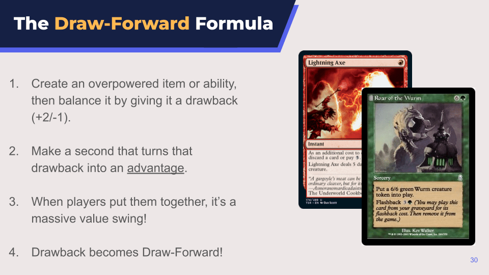 The Draw-Forward combo works because it presents something with a cost, then introduces a way to turn that cost into an advantage.